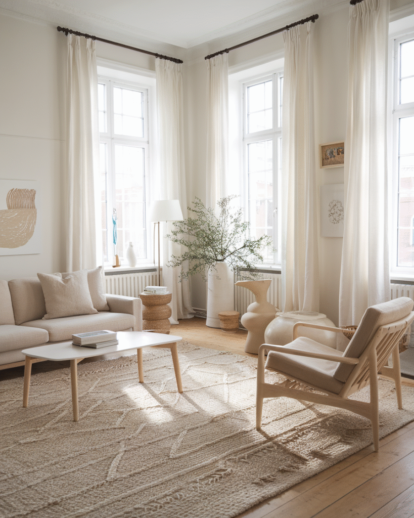 Scandinavian design is still a go to style for women who love calm and functional spaces. In 2025 the look is leaning even softer with creamy neutrals that feel peaceful. These living rooms often include light oak furniture which keeps the room fresh and natural. Woven rugs in muted tones help warm up the floor and make the space feel cozy without adding clutter. Earth toned ceramics, soft throw blankets, and a bit of greenery complete the look. The overall effect is a living room that feels airy, grounded, and easy to maintain which is why it remains such a popular choice.