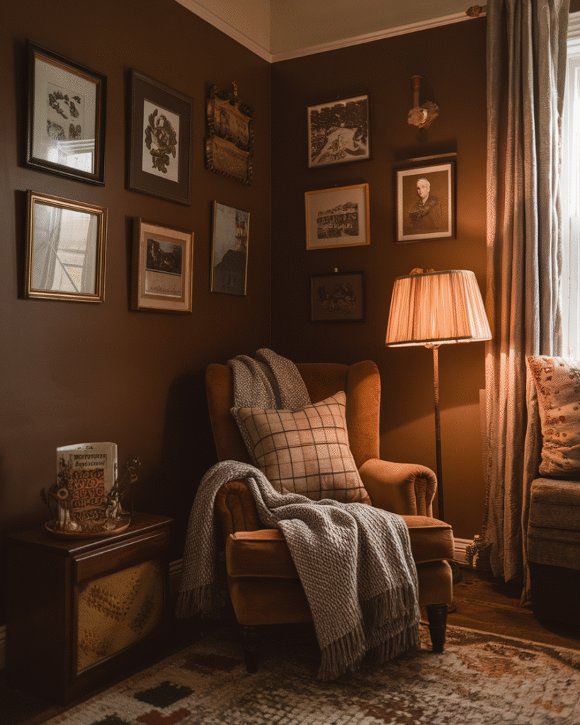 Reading corners are becoming more intentional, and chocolate brown is the shade that makes them feel instantly cozy. The colour has this nostalgic warmth that reminds people of old libraries or vintage studies. When you pair chocolate walls with vintage artwork, a soft reading lamp, and a plush chair, the entire space feels comforting and personal. Women who love slow living are drawn to this trend because it invites you to slow down and enjoy a quiet moment. A soft throw blanket and a small side table for your coffee or tea complete the look and make it a perfect little hideaway inside your home.