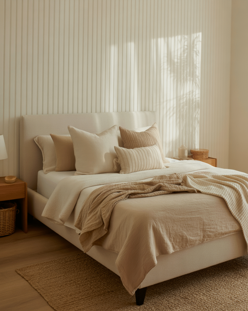 Soft beige beadboard is one of those looks that instantly makes a bedroom feel warmer and more comforting. The vertical lines help stretch the height of the room which makes the space feel a little bigger and a lot more elegant. When you pair this with neutral bedding, woven baskets, and softer lighting, the whole room starts to feel like a peaceful spa retreat. It is the kind of wall that quietly transforms the atmosphere without shouting for attention.
