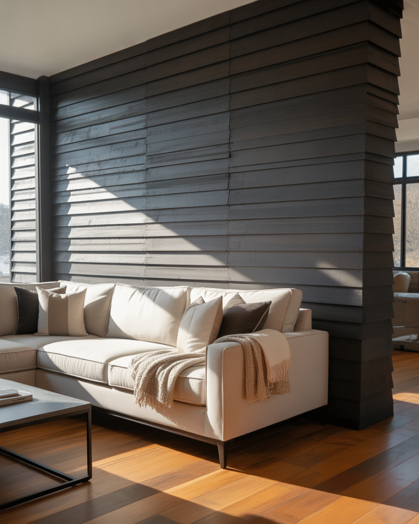 If you want something bold that still feels polished, charcoal shiplap is a beautiful option. The dark color brings richness into the room and the horizontal lines help ground your layout which makes your sofa and decor feel more intentional. This trend works so well with cream or ivory furniture and it really pops against warm wood flooring. It gives the space a modern, editorial feel that looks like something out of a designer showroom.