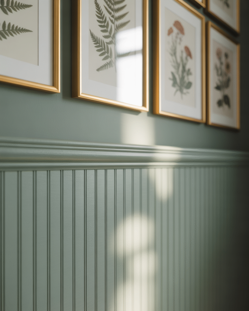 Muted sage is one of those colors that instantly brings calm energy into a room. When you pair it with beadboard halfway up the wall it creates a soft cottage inspired look that feels fresh and cozy at the same time. This design works beautifully in bedrooms, reading corners, or small living spaces. Add white trim, a few gold accents, and maybe some botanical prints and the whole room feels gentle and nature inspired which fits perfectly with this year’s organic design trends.