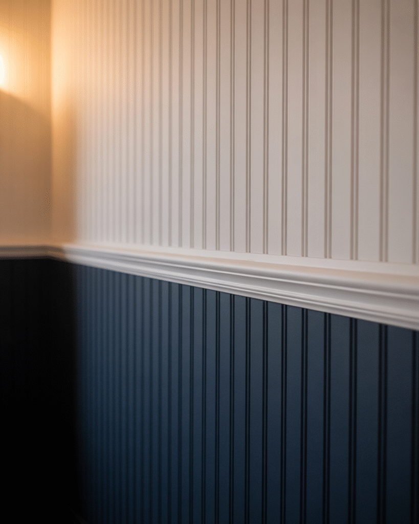 This trend feels stylish and a little bit dramatic in the best way. Two tone beadboard lets you use one color for the bottom half and a softer shade for the top half which creates a layered look that feels high end. Deep navy on the bottom and soft white on top is a favorite combination because it feels clean and sophisticated. This idea works beautifully in bedrooms or polished living spaces where you want the walls to play a bigger role in your overall design.