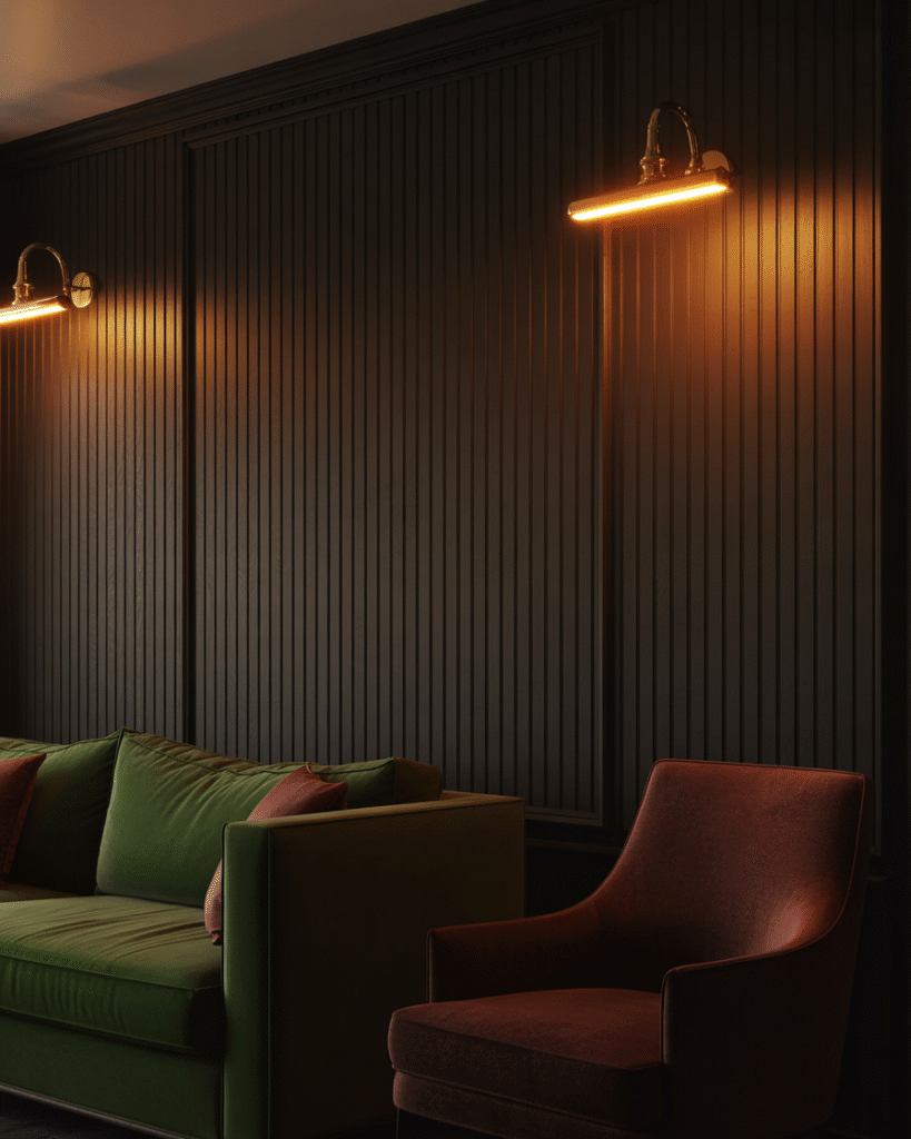 Another trending idea is adding sconces, LED strip lighting, or small accent shelves onto your panelled wall. Lighting especially makes the grooves and patterns of your panels pop. Mixing warm metallics like brass or matte gold against a dark panel wall creates a luxury look that feels incredibly elegant.