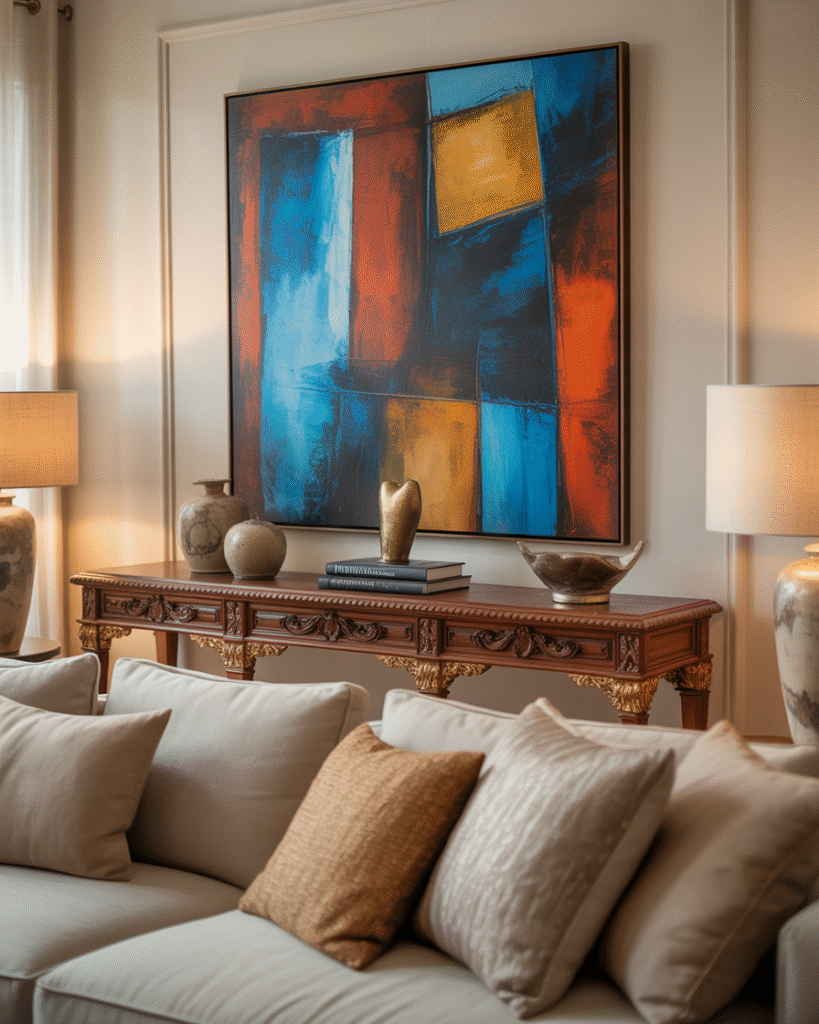 Another beautiful trend features large modern artwork placed above traditional furniture. You might see a bold abstract piece hanging above an ornate console or a classic carved chair. The contrast brings energy into the room which makes it feel curated instead of overly formal. The artwork helps balance the weight of the traditional furniture. It also creates a nice focal point that brings the whole mix together. This trend is especially popular among women who want to show their personality without replacing sentimental or inherited items.