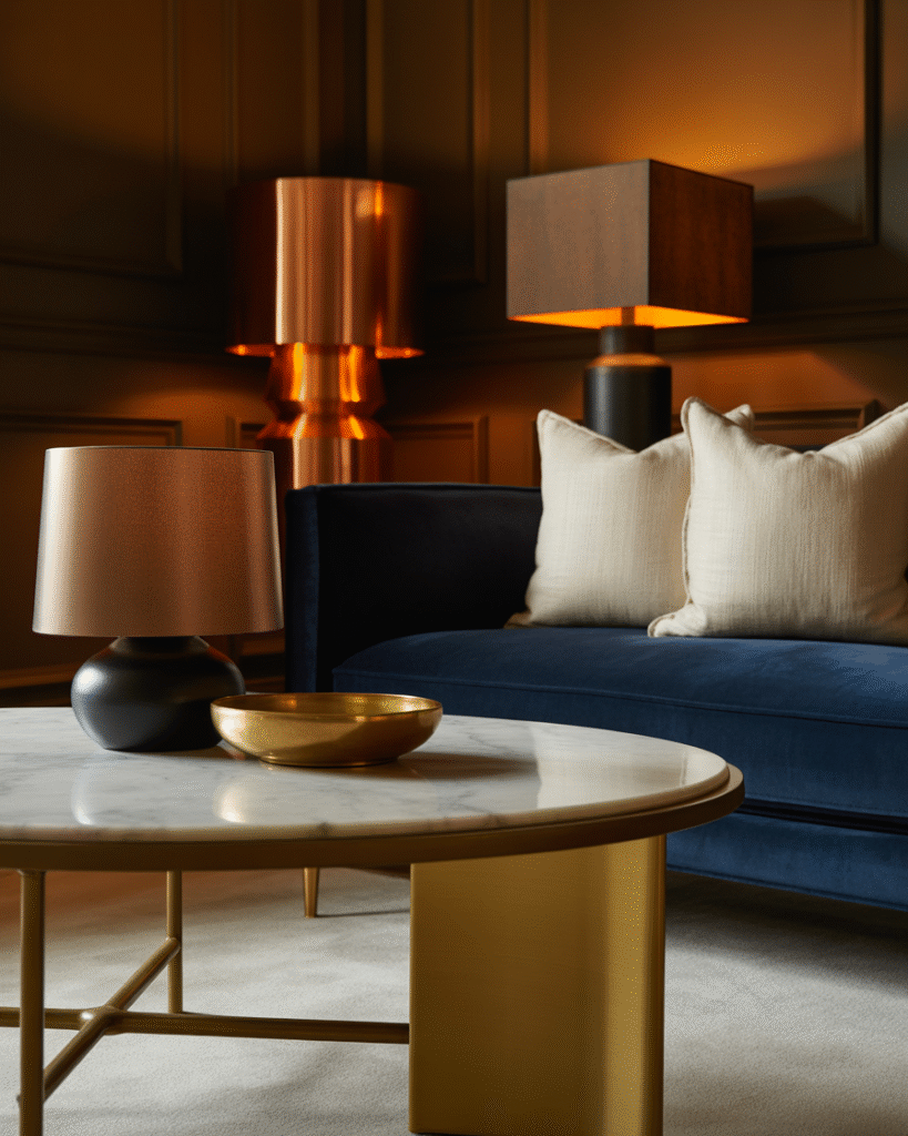 - Use materials intentionally. Mix glass with wood, linen with velvet, or brass with matte black. These combinations help the room feel layered and dimensional.