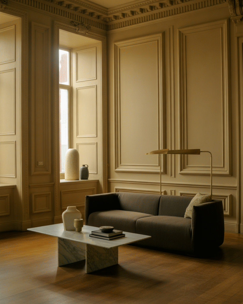A beautiful trend for 2025 features classic architectural elements paired with clean modern decor. Women are keeping traditional moldings, archways, wainscoting, and wood paneling, then decorating the room with simple ceramics, straight line furniture, and contemporary lighting. This creates a balanced backdrop that feels timeless but not outdated. The modern pieces bring freshness while the traditional bones of the room offer depth and charm. It is an easy way to update a classic home without losing its story.