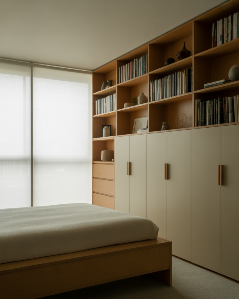 Vertical storage statement walls are one of the smartest small bedroom design ideas for 2025. Instead of scattering storage around the room, everything is brought into one clean, intentional wall. Floor-to-ceiling shelves, closed cabinets, and open niches create a built-in look that feels custom and expensive. This design keeps clutter hidden while still allowing room for books, decor, and personal items. In a small bedroom, using height instead of floor space makes a massive difference and helps the room feel organized rather than cramped.