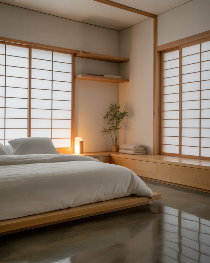 Low-profile Japanese-inspired bedrooms continue to grow in popularity because they visually open up the room. Lower beds naturally create more wall space above them, which makes ceilings feel higher. Natural wood tones, simple furniture shapes, and uncluttered layouts define this look. There is a strong focus on balance and calm, which works especially well in small bedrooms where too much furniture can quickly overwhelm the space. This style feels intentional, grounded, and surprisingly cozy.