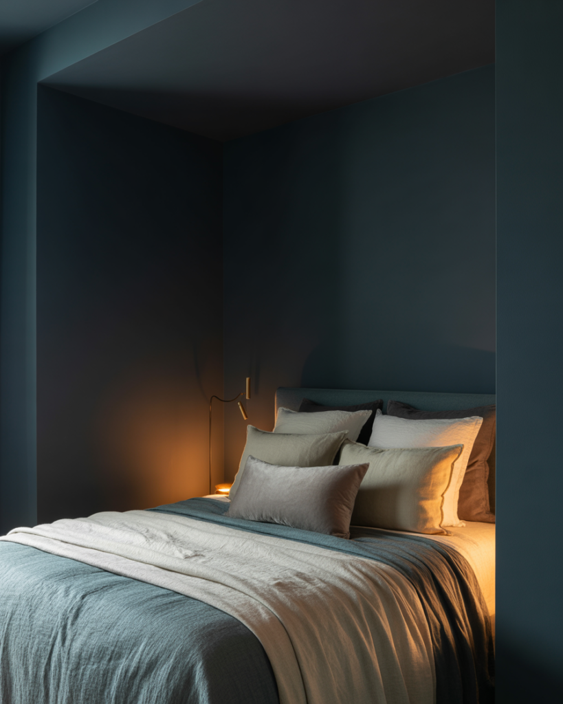 Dark and moody small bedrooms are proving that small spaces do not need to be light to feel open. Deep shades like charcoal, forest green, and navy actually help walls visually recede when paired with the right lighting. Soft lamps, warm bulbs, and subtle accent lighting prevent the space from feeling heavy. Textured bedding and matte finishes add depth without clutter. This trend works best for people who want their bedroom to feel like a cozy retreat rather than a bright showroom.