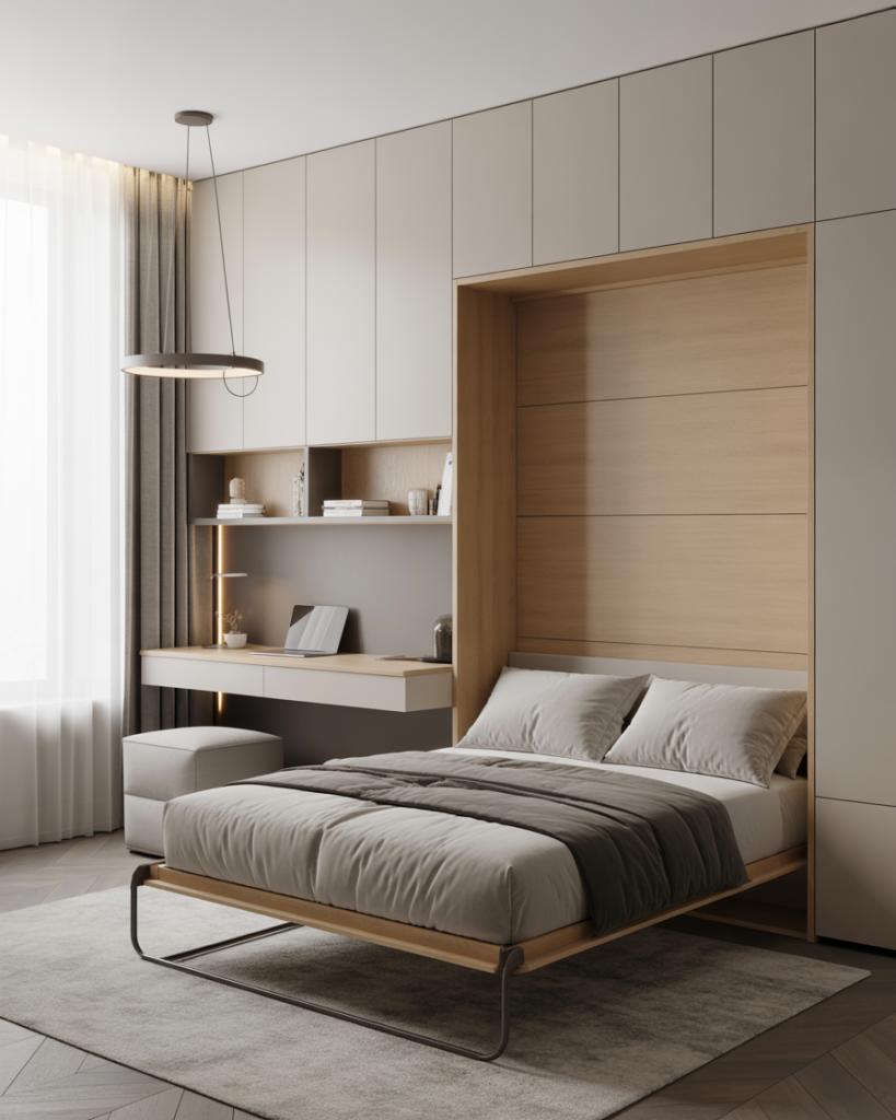 Multifunctional guest bedroom offices are becoming essential as homes continue to work harder. This design blends comfort and practicality without making the room feel like a workspace. Wall beds, daybeds, or slim sofa beds free up floor space during the day, while a compact desk fits neatly into a corner or built-in niche. Storage is usually integrated to keep work items out of sight when guests arrive. This approach makes small bedrooms flexible without sacrificing style.