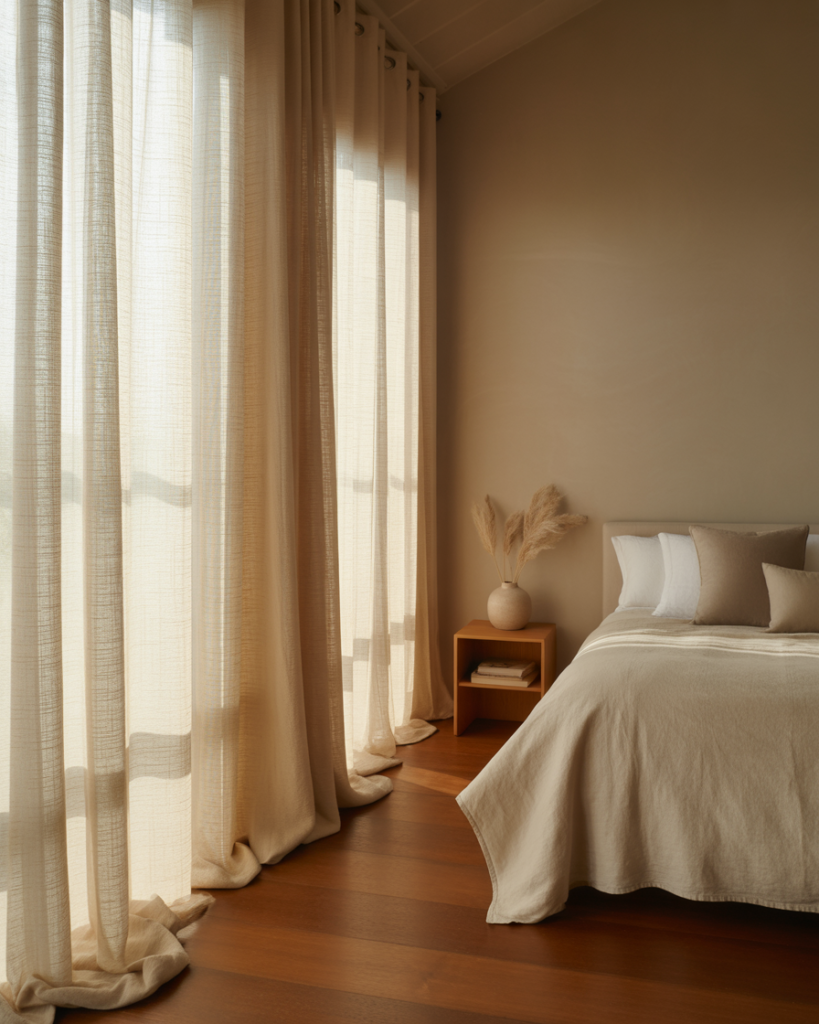 Ceiling-height drapery designs are one of the simplest ways to visually change a small bedroom. Hanging curtains from the ceiling rather than the window frame draws the eye upward and instantly makes the room feel taller. Lightweight fabrics like linen or sheer blends allow natural light to filter through while still adding softness. This design trick works especially well in apartments or older homes where ceiling height needs a visual boost.