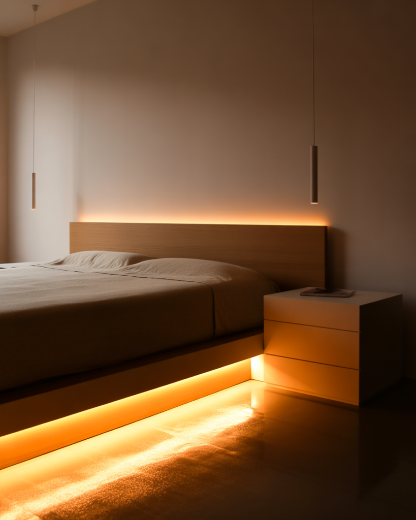 Smart lighting focused bedrooms are shaping how small bedrooms feel and function in 2025. Instead of bulky lamps, lighting is built into the space itself. LED strips under the bed, behind headboards, or inside closets add depth and warmth without taking up any room. Dimmable controls allow you to shift the mood from bright and functional to calm and relaxing with ease. In a small bedroom, lighting like this creates layers, which makes the space feel larger and more thoughtfully designed.