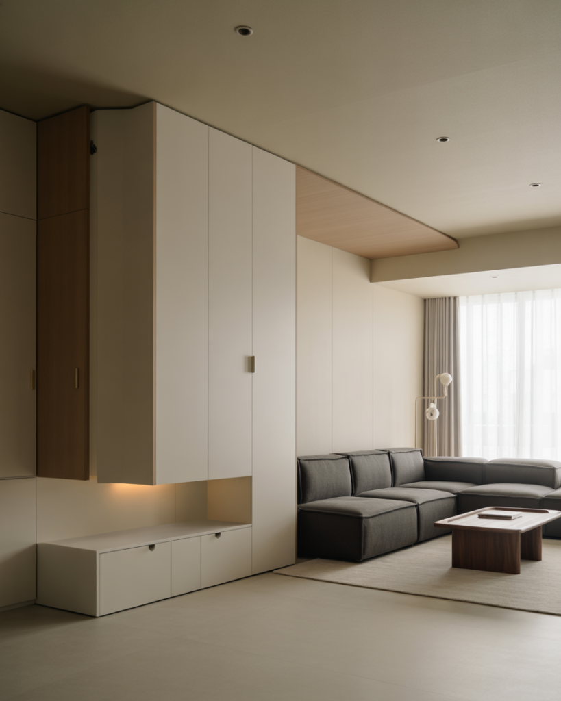 Hidden wall storage panels are becoming one of the most talked-about small home storage solutions for 2025, especially in modern apartments and compact homes. At first glance, these walls look completely seamless, almost like a design feature rather than storage. Cabinets and compartments are tucked behind flat panels that blend into the wall color or material, which keeps the space feeling clean and uncluttered.