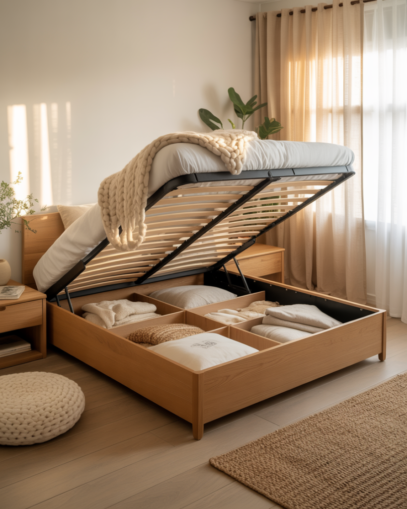 These beds are perfect for storing bulky items like extra bedding, off-season clothing, or even suitcases. Because nothing is visible from the outside, the bedroom feels more open and less crowded. For small home storage solutions, this is one of the smartest ways to reclaim space without adding extra furniture.