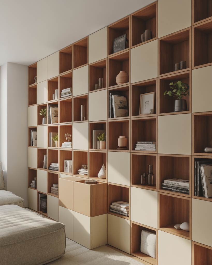 In small living rooms or home offices, modular cube storage walls act as both storage and design. Open cubes can display books or decor, while closed cubes hide clutter. This balance keeps the space practical while still feeling styled and personal.