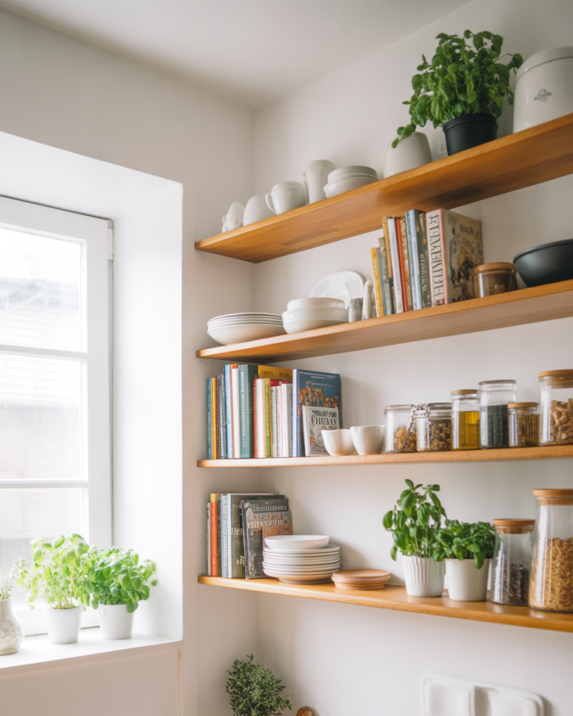 Vertical open shelving is becoming one of the smartest small kitchen decor ideas for 2025. When shelves extend upward instead of spreading outward, the kitchen instantly feels taller and more open. This approach works especially well in apartments and narrow kitchens where wall space is limited. Everyday dishes, glass jars, cookbooks, and a few small plants can be styled in a way that feels lived in rather than staged. The key is keeping the color palette simple so the shelves feel intentional and calm instead of cluttered.
