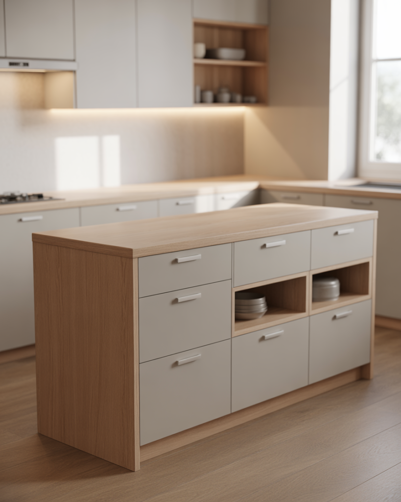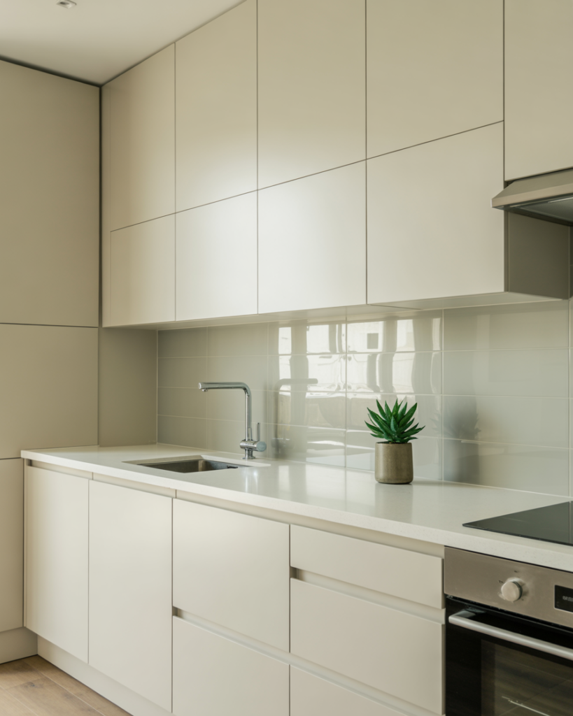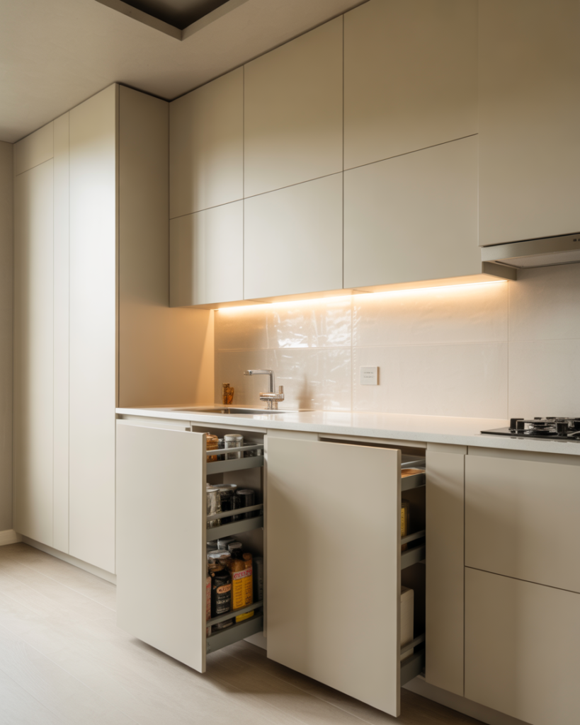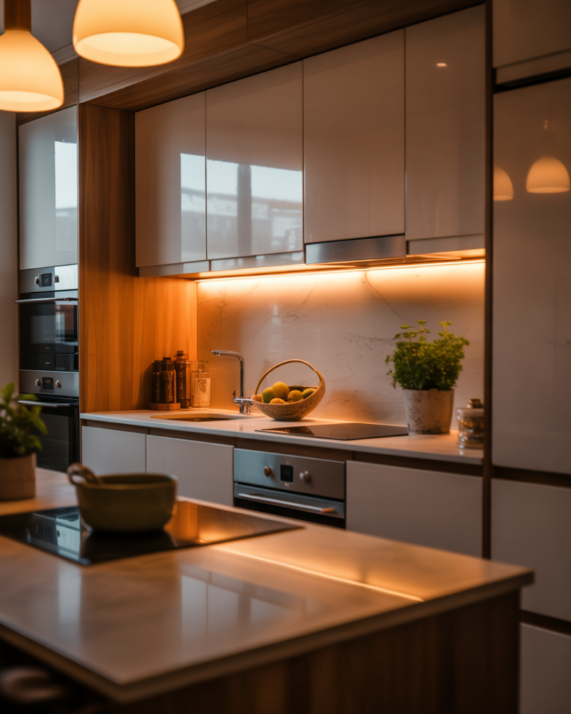 In 2025, small kitchen decor ideas are all about balance. Mix closed storage with open elements to avoid visual overload. Choose matte finishes to reduce glare and fingerprints. Integrated lighting is no longer optional, it is essential for both ambiance and function.
