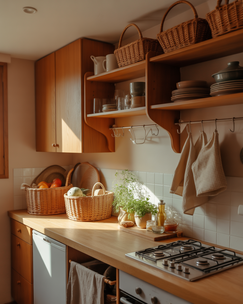 Smart decor choices double as storage solutions. Decorative baskets, labeled jars, and slim rolling carts allow you to store essentials without sacrificing style. Small kitchen decor ideas help you stay organized while keeping frequently used items within reach.