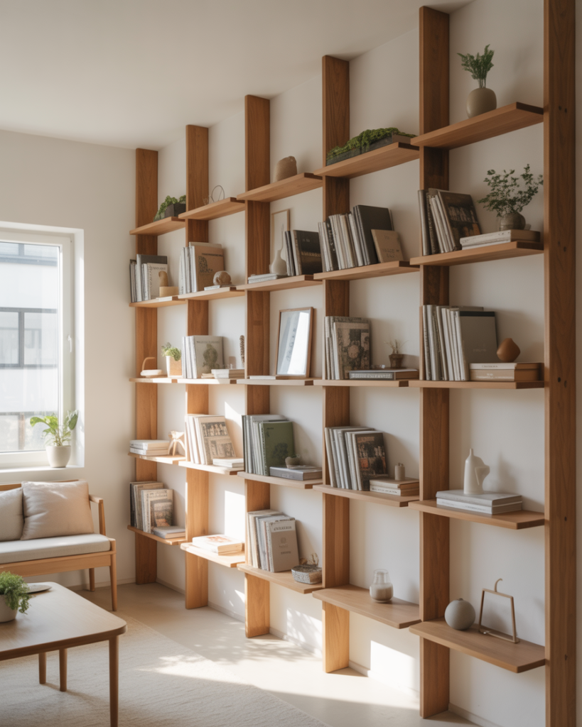 When floor space is limited, vertical space becomes your best friend. This layout uses tall shelving units and wall mounted cabinets to draw the eye upward, making the room feel taller and more open. Storage is built into the design rather than added as an afterthought. The result is a living room that feels organized, airy, and visually balanced without sacrificing functionality.