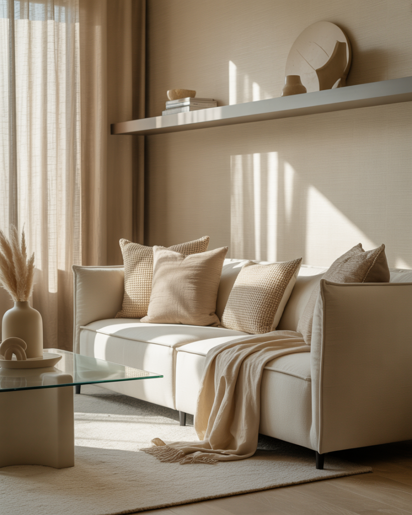 This layout relies on layers rather than bold statements. Furniture placement stays simple and practical, while texture does the heavy lifting. Think soft rugs, linen sofas, woven accents, and subtle variations of beige and cream. The space feels warm and refined without visual noise. This approach works beautifully in small living rooms because it adds depth without cluttering the layout.
