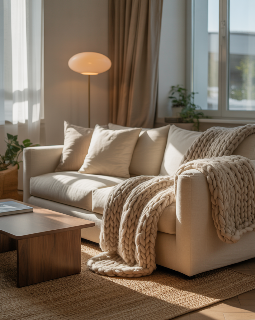 Soft minimalism is everywhere in 2025, especially in apartments where visual calm really matters. This look focuses on creamy whites, warm beige tones, and gentle textures that make a space feel cozy instead of cold. Nothing feels stark or unfinished here. Think linen curtains, plush area rugs, and sofas with soft curves. The beauty of this style is that it makes a small apartment feel intentional and peaceful without looking empty or boring.