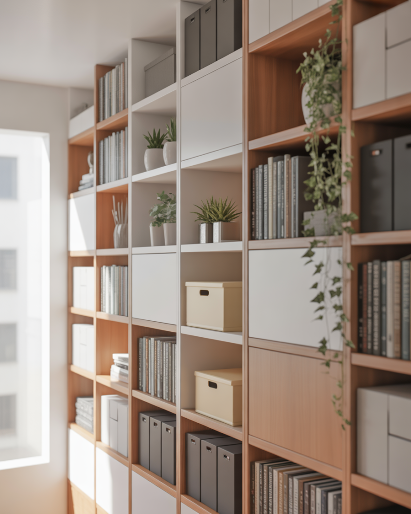 When floor space is limited, walls become your best design tool. Vertical storage walls are a major trend for small space decorating ideas for apartments in 2025. Full-height shelving draws the eye upward, which instantly makes ceilings feel taller. When styled with intention using books, plants, and a few decorative objects, these shelves feel airy instead of heavy and double as a design statement.