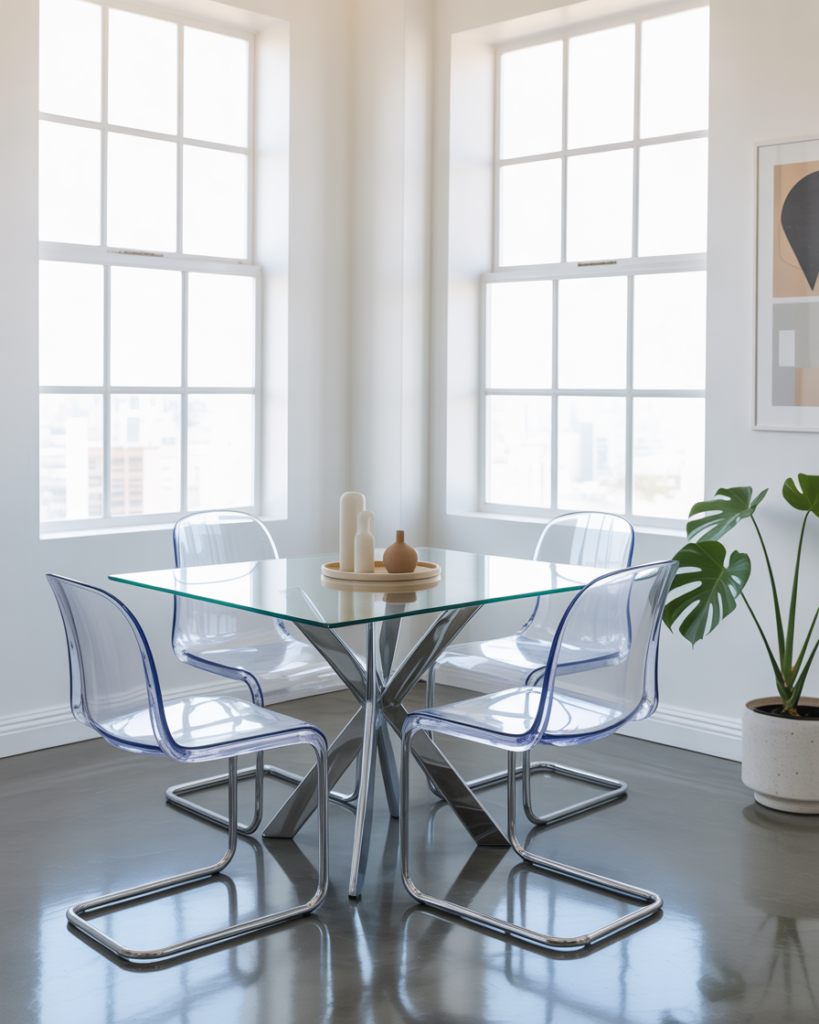 Transparent furniture is a quiet design trick that makes a huge difference in small apartments. Glass tables and lucite chairs allow light to pass through, which visually opens up the room. In dining areas or living rooms, these pieces almost disappear, making the space feel larger and less crowded. This trend works beautifully when paired with warm textures to keep the room from feeling too sleek.
