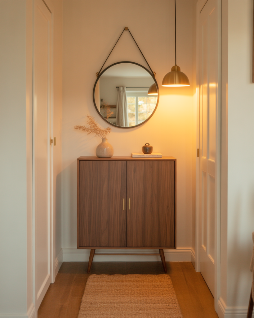 A small entryway can easily become a dumping ground if it is not organized properly. Slim entryway cabinets solve that problem by offering storage without blocking walkways. These narrow pieces are perfect for shoes, bags, and everyday grab-and-go items. They keep the space feeling open while still giving everything a proper home, which makes a small entry feel calm instead of chaotic.