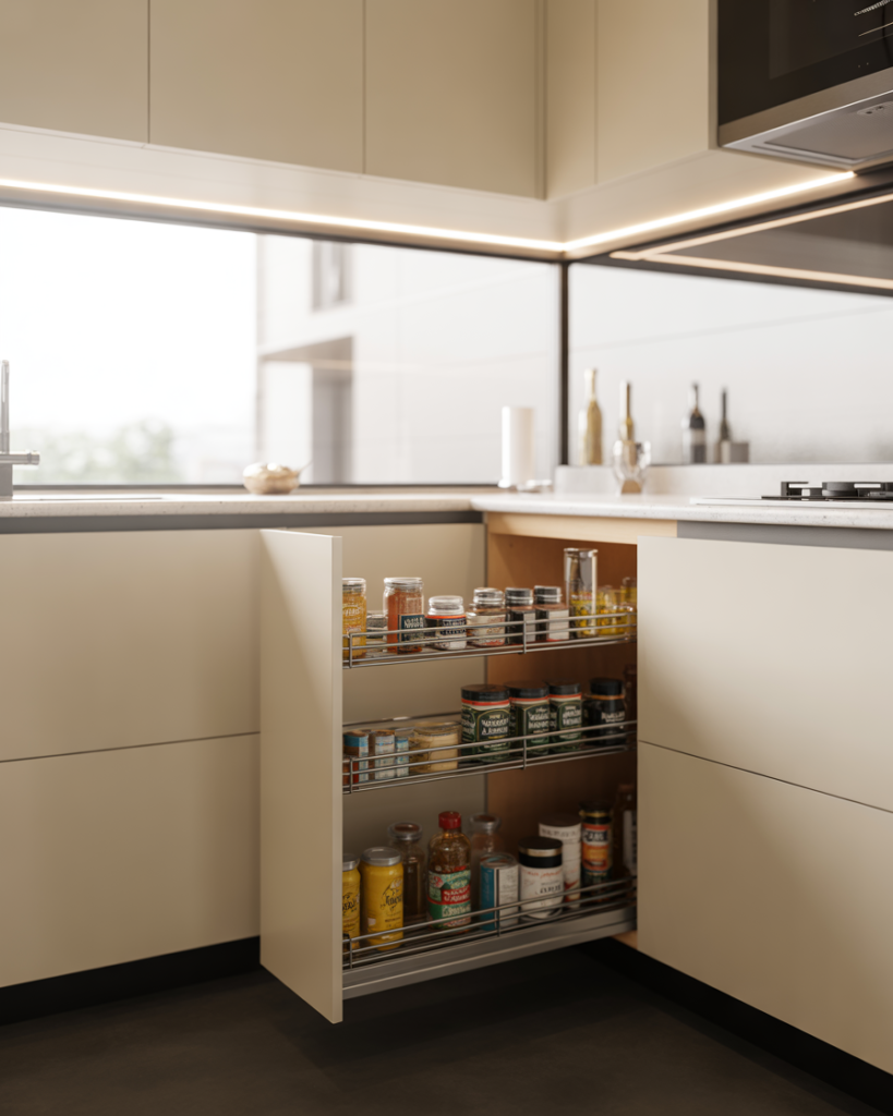 Small kitchens benefit more than any other space from smart organization. Pull-out pantry units make use of narrow gaps that usually go to waste. These units slide out smoothly, giving you full visibility of food and supplies, which makes cooking easier and faster. They also help prevent overbuying since you can actually see what you already have.