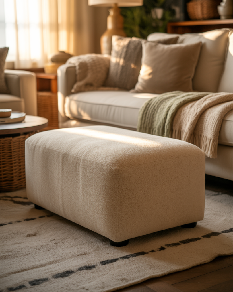 Hidden storage ottomans are one of my favorite small space organization tips because they work hard without looking like storage. They provide seating, act as a coffee table or footrest, and hide clutter inside. In family homes, they are perfect for blankets, toys, or extra pillows. In smaller apartments, they help keep the living room looking clean and intentional.