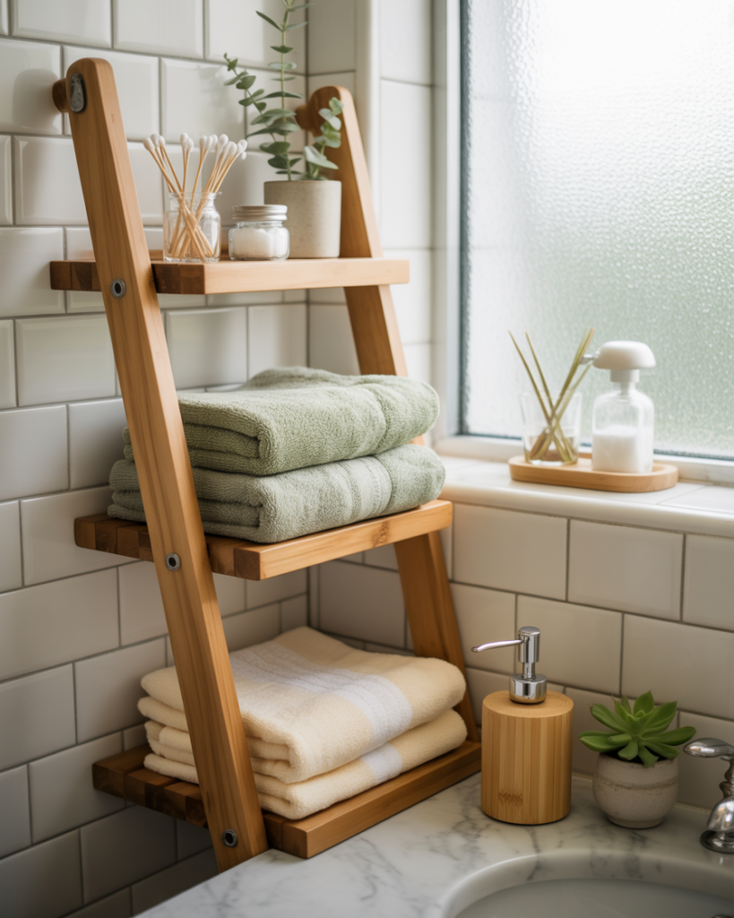 Bathrooms often lack storage, especially in smaller homes. Ladder shelving is a simple and stylish solution that adds vertical storage without permanent installation. These pieces are perfect for towels, baskets, and everyday toiletries. They lean against the wall, which makes them renter-friendly and easy to move if your needs change.